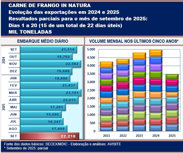 Completados 15 dos 22 dias úteis de setembro corrente, as exportações de carne de frango in natura mantêm-se acima das 20 mil toneladas diárias, alcançando volume – 22.218 toneladas/dia – que supera em 24,8% e em 3,3% o que foi exportado, respectivamente, em agosto passado e em setembro de 2024.