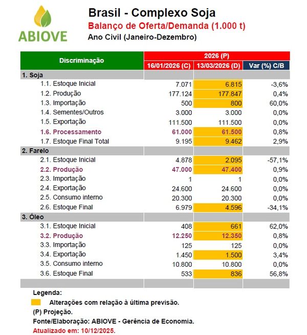"O ajuste positivo nas projeções de esmagamento demonstra que o setor está preparado para absorver a safra recorde, transformar essa matéria-prima em proteína e bioenergia e fortalecer a segurança alimentar e energética brasileiras", afirma.