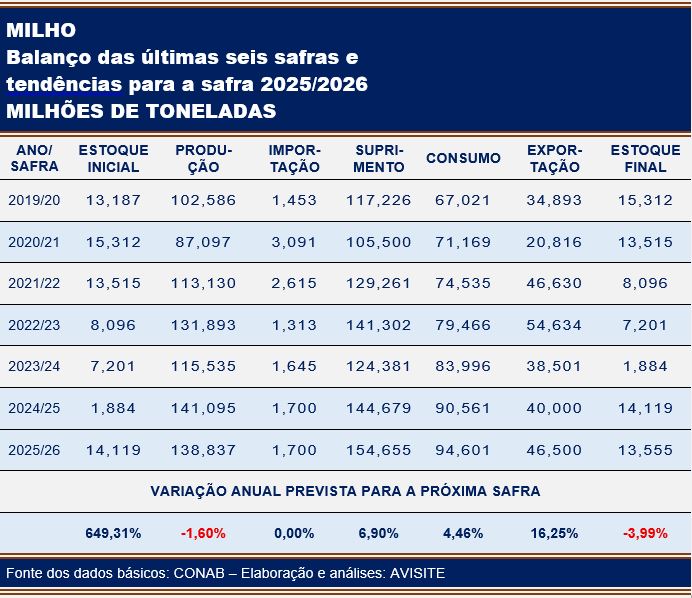 Ainda que a produção brasileira de milho da safra 2025/2026 recue 1,6% (última previsão da CONAB) e mesmo que as importações do grão tenham crescimento “zero”, o suprimento do próximo ano irá aumentar perto de 7%. Simplesmente porque o estoque inicial do grão vai ser quase 650% maior que o registrado um ano antes, no princípio de 2025.